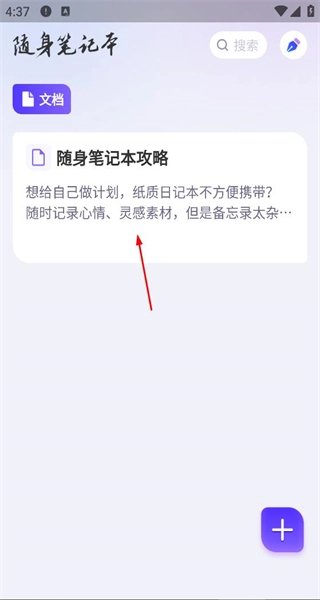 1、打开随身笔记本应用,进入文档页面后,找到“随身笔记本攻略”文档,点击该文档即可进入编辑界面。