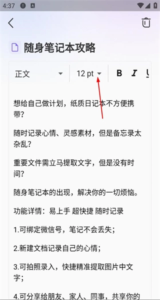进入文档编辑页面后,既能查看文档内容,也能看到字体大小等格式调整选项,还可以对内容进行编辑操作。