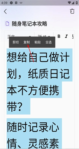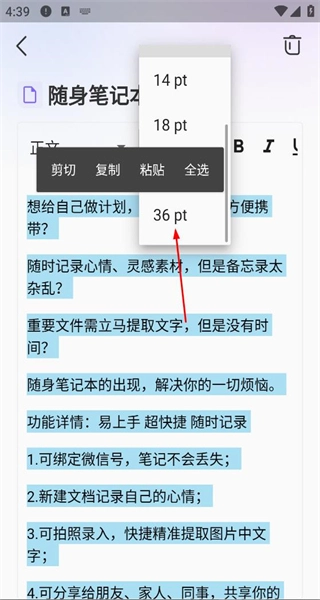 3、选中部分文本内容,调出操作菜单,选择字体大小选项,将字号调整为36pt。