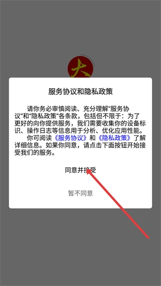 1、仔细阅读【服务协议】与【隐私政策】中的各项条款,在充分了解信息收集的相关说明后,点击弹窗里的【同意并接受】按钮,就能进入应用开始使用其提供的服务。
