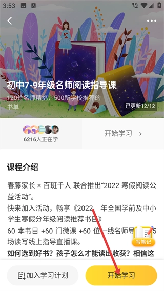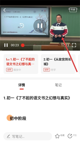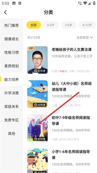 2、在分类页面挑选目标课程(例如“初中7-9年级名师阅读指导课”),点击进入该课程的详情页面。