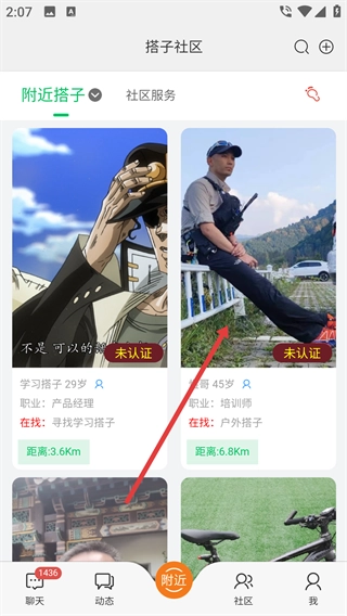 1、在搭子社区的聊天页面,点击底部导航栏的“附近”按钮,即可进入附近搭子列表页面。