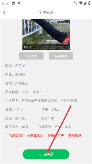 3、进入个性名片页面后,点击底部的“与Ta联系”按钮,即可进入和该搭子的聊天界面。