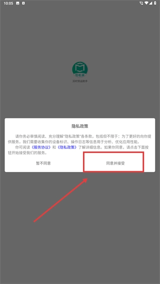1、仔细阅读【隐私政策】和【服务协议】的条款内容后,点击【同意并接受】按钮,即可进入应用的后续操作流程。