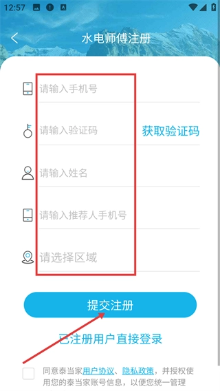 2、在身份选择界面找到并点击【水电师傅】选项,即可进入水电师傅的注册信息填写页面。