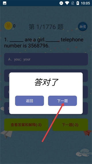 4、完成题目后,若出现【答对了】的弹窗,您可以选择点击【返回】退出当前习题,或者点击【下一题】继续进行下一道英语习题的练习。