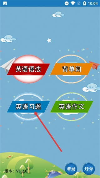 在英语学习应用的主界面,用户可以选择【英语语法】【背单词】【英语习题】【英语作文】等功能模块,以此开启相应的英语学习内容。