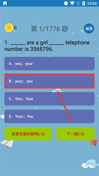 3、在【第1/1776题】的习题页面,选择对应的选项完成题目后,可点击【查看答案和解释-(-2)】查看解析,或点击【下一题-(-2)】继续练习。