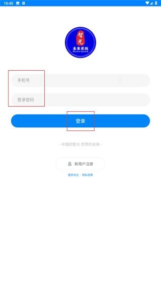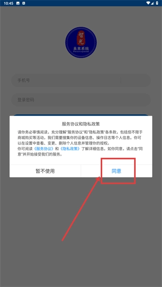 1、在【智光-未来系统】的服务协议页面,点击【同意】按钮以确认接受《服务协议》和《隐私政策》,随后进入应用的登录流程。