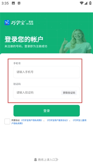 1、打开【巧学宝】的登录页面,在【请输入号】的输入框中填写对应信息,接着点击【获取验证码】按钮,将收到的验证码填入【请输入验证码】输入框,最后点击【登录】按钮完成登录操作。