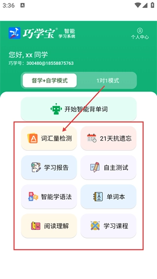 2、登录后进入【巧学宝】主界面,可选择【督学+自学模式】或【1对1模式】,还能使用【词汇量检测】、【学习报告】等学习功能。