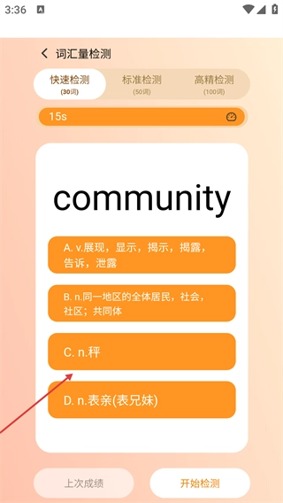 3、进入【词汇量检测】后选择【快速检测-30词】,其中单词【community】对应的正确选项为B,其释义为“n.同一地区的全体居民;社会;社区;共同体”。