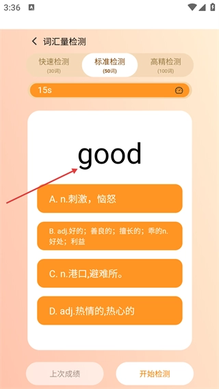 4、切换至【标准检测-50词】模式,单词【good】对应的正确选项为B(adj.好的;善良的;擅长的;乖的-n.好处;利益)。
