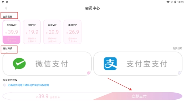 4、进入会员中心,选择【会员套餐】(例如永久SVIP),确定【支付方式】后勾选相关协议,点击【立即支付】即可开通会员。