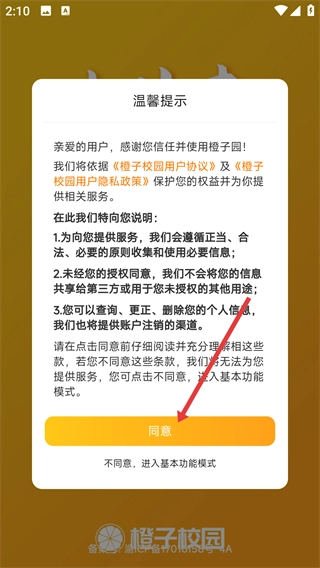 1、仔细阅读《橙子校园用户协议》《橙子校园用户隐私政策》以及相关信息规则说明,点击【同意】按钮后,即可进入应用的完整服务功能操作界面。