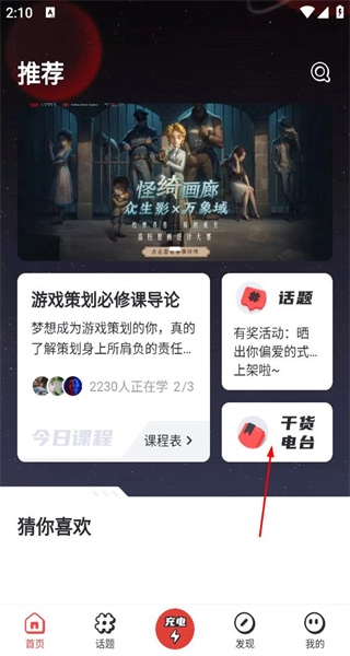 1、打开软件首页后,能够查看推荐课程,点击干货电台这一选项,即可进入专题内容的浏览页面。