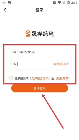 3、进入登录页面后,依次填写账号、获取并输入验证码,勾选《用户服务协议》与《隐私政策》,随后点击【立即登录】按钮,即可完成账号登录流程。