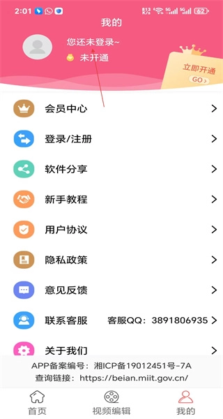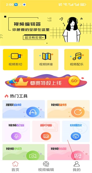 1、启动视频编辑器,进入主界面后,能看到视频剪切等功能选项,接着点击“我的”,进入个人中心页面。