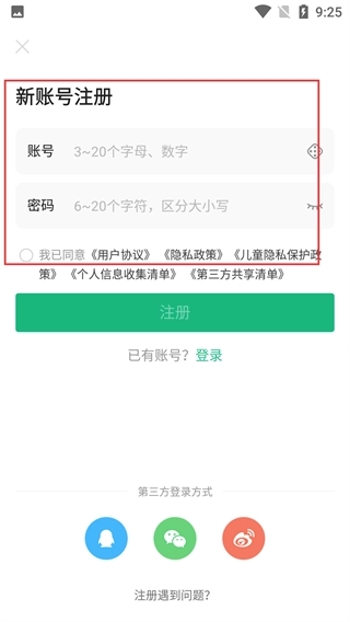 3、在账号验证登录页面,点击右上角的【注册】按钮,即可进入新账号注册界面,此外还支持第三方账号直接登录。