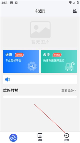 1、在【车运云】首页,既能使用【维修】【救援】功能,也可以通过底部的【我的】入口进入个人中心,从而获取更多服务选项。