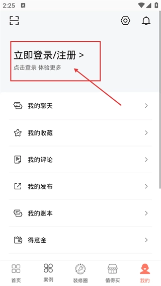 2、进入个人中心后,点击【立即登录/注册】按钮,完成登录或注册操作后,就能使用【我的聊天】-【我的收藏】等功能了。
