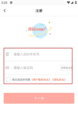 4、进入注册页面后,先输入【号】,接着获取并填写【验证码】,最后点击【下一步】按钮。