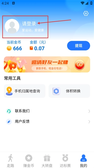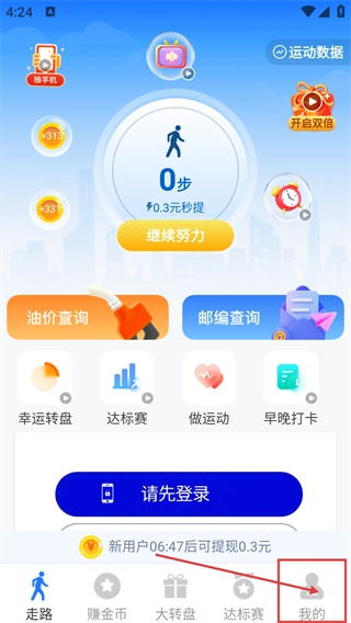 1、打开应用进入首页后,点击底部的【我的】选项进入个人中心,登录账号后就能使用金币积累、提现等相关功能。