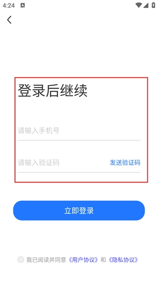 4、选择【账号登录】选项后,输入账号,点击【发送验证码】按钮并填写收到的验证码,最后点击【立即登录】按钮即可完成登录操作。
