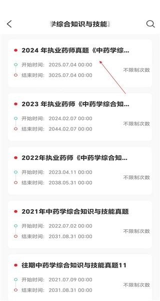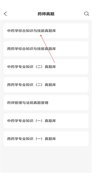 1、打开软件的真题页面,能看到各类学科真题库选项,选择中药学综合知识与技能真题库,进入对应的真题列表页面。