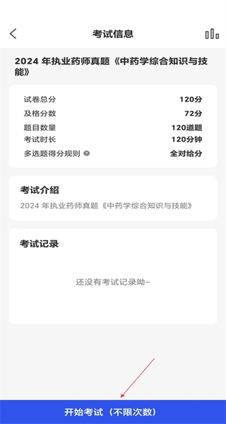3、进入考试信息页面,查看试卷总分等相关信息后,点击开始考试按钮,即可进入真题作答的答题界面。