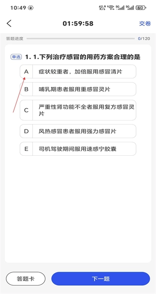 4、进入答题页面后,先仔细阅读题目内容,然后选择对应的选项来完成当前题目的回答,接着点击下一题按钮,继续完成后面的题目。