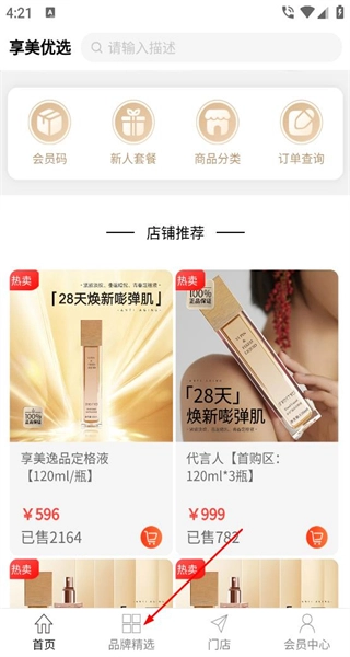 进入享美优选首页,能看到会员码、新人套餐等入口,同时设有店铺推荐区域,该区域展示了多款美妆商品,并标注了对应的价格和销量信息。