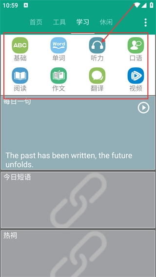 2、【学习】模块下设有【基础】【单词】【听力】等功能入口,点击对应入口即可进入相关学习内容页面。