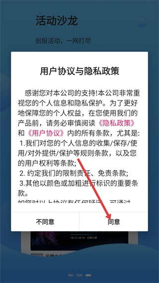 1、在【活动沙龙】的【用户协议与隐私政策】弹窗里,仔细阅读相关条款后,点击【同意】按钮,就能进入应用的后续操作界面。
