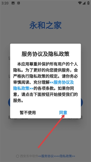 当弹出【服务协议及隐私政策】窗口时,点击窗口中的【同意】按钮,就能继续进入应用的后续页面。