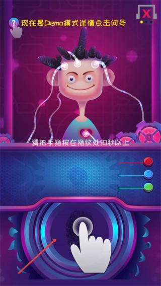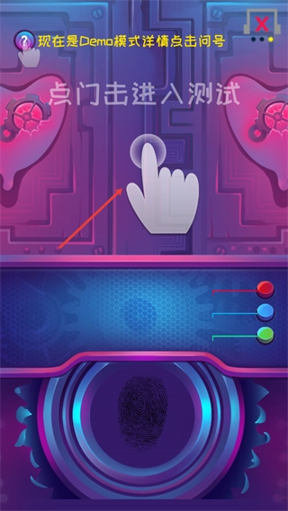 2、在界面上点击指引位置即可进入测试环节,当前处于【Demo模式】,能通过对应按钮触发流程,下方设有【指纹识别】区域,供后续进行操作。