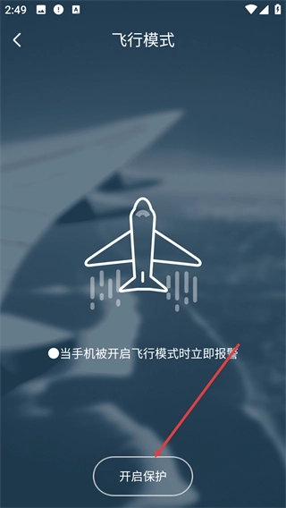 3、进入【飞行模式】页面后,先确认“开启飞行模式时立即报警”这一防护逻辑,随后点击【开启保护】按钮来启动防护功能。