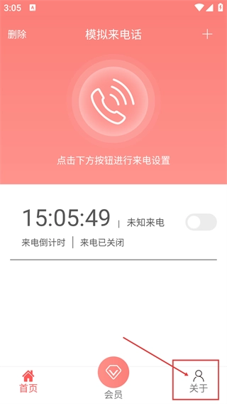 1、在【模拟来电话】的首页,界面会提示点击下方按钮进行来电设置,另外也能点击底部的【关于】按钮,进入应用相关信息页面。