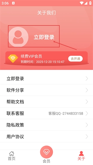 进入【关于我们】页面后,能看到【立即登录】按钮,点击此按钮可进入登录界面,同时也能查看会员续费等相关选项。