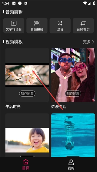 1、在首页的视频模板区域,找到【午后时光】模板,点击其下方的【制作同款】按钮,即可进入该模板的创作页面。