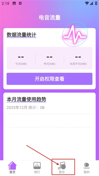 1、进入【电音流量】界面后,点击底部的【音乐】选项;要是需要查看【数据流量统计】,可以点击【开启权限查看】按钮来获取相关数据。