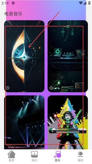 2、进入【电音音乐】界面后,找到对应的电音封面并点击,就能进入该电音的【歌曲详情】页面,查看与之相关的内容。