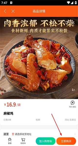 4、进入麻椒鸡的商品详情页面,确认好商品相关信息后,点击“立即购买”按钮,以此完成商品的选购流程。