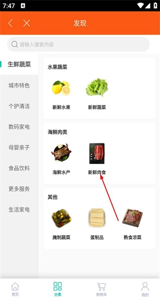 2、进入分类页面后,选择海鲜肉类分类,接着在该分类下找到新鲜肉类子分类,点击此选项即可进入对应的页面。
