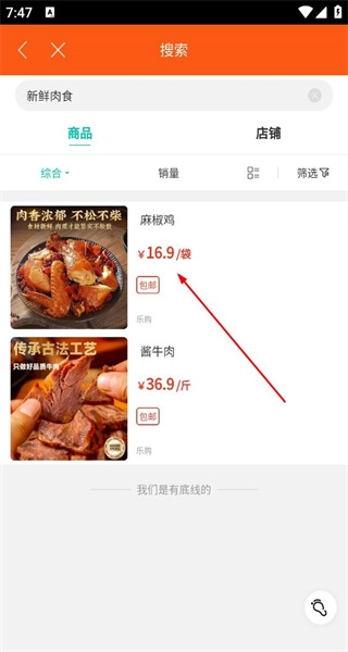 3、在新鲜肉类的商品列表里找到目标商品麻椒鸡,点击这个商品,查看它展示的价格等详情信息。