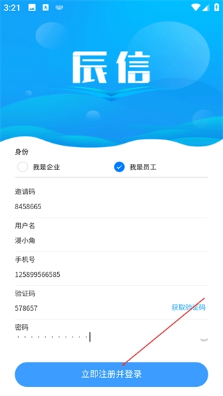 3、进入注册界面后,首先选择对应的身份(例如【我是员工】),接着填写邀请码、用户名、号码,获取并输入验证码,设置好密码后点击【立即注册并登录】按钮。