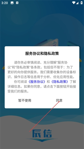 打开应用后,会弹出【服务协议和隐私政策】的提示,阅读条款内容后点击【同意】按钮,就能进入应用的登录相关界面。