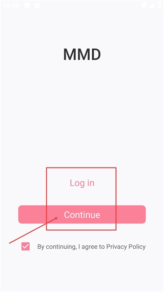 1、界面显示【MMD】,勾选同意【Privacy-Policy】后,点击【Continue】按钮,就能进入应用的后续功能界面。
