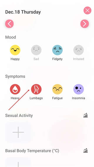 4、在记录页里,选择【Mood】分类下的【Hy】选项,以及【Symptoms】分类下的【Heavy】-【Lumbago】等选项,以此完成信息记录。