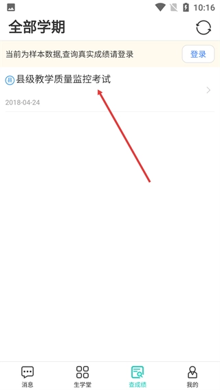 1、进入【生学堂(学生)】主界面后,点击底部的【查成绩】选项,就能进入成绩查询页面,查看各项考试的成绩信息。
